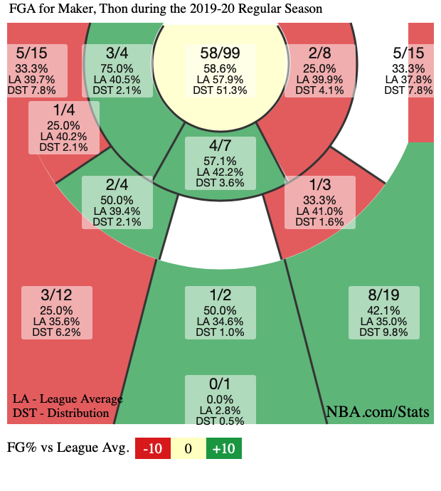 In an attempt to expand his capabilities as an offensive player, the Pistons pushed Maker to shoot more three-pointers. In 2018-2019, he attempted a career-high 2.6 threes per game. In the 60 games in 2019-2020, he only attempted 1.1 despite making them at a slightly higher clip (34.4% in 19-20 versus 33.3% in 18-19). Without the threat of outside shooting or, based on that shot chart, competent shooting from one entire side of the floor, Maker was a non-factor.