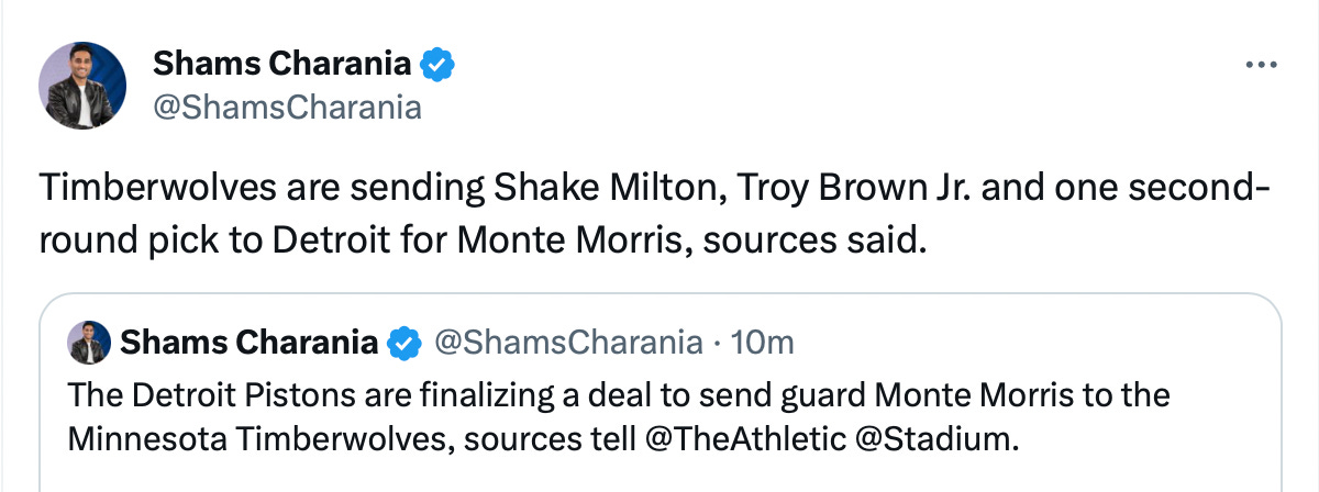 The Detroit Pistons are sending point guard Monte Morris to the Minnesota Timberwolves for guard Shake Milton, forward Troy Brown Jr., and a 2030 second-round pick, according to Shams Charania of The Athletic.
