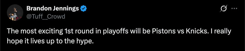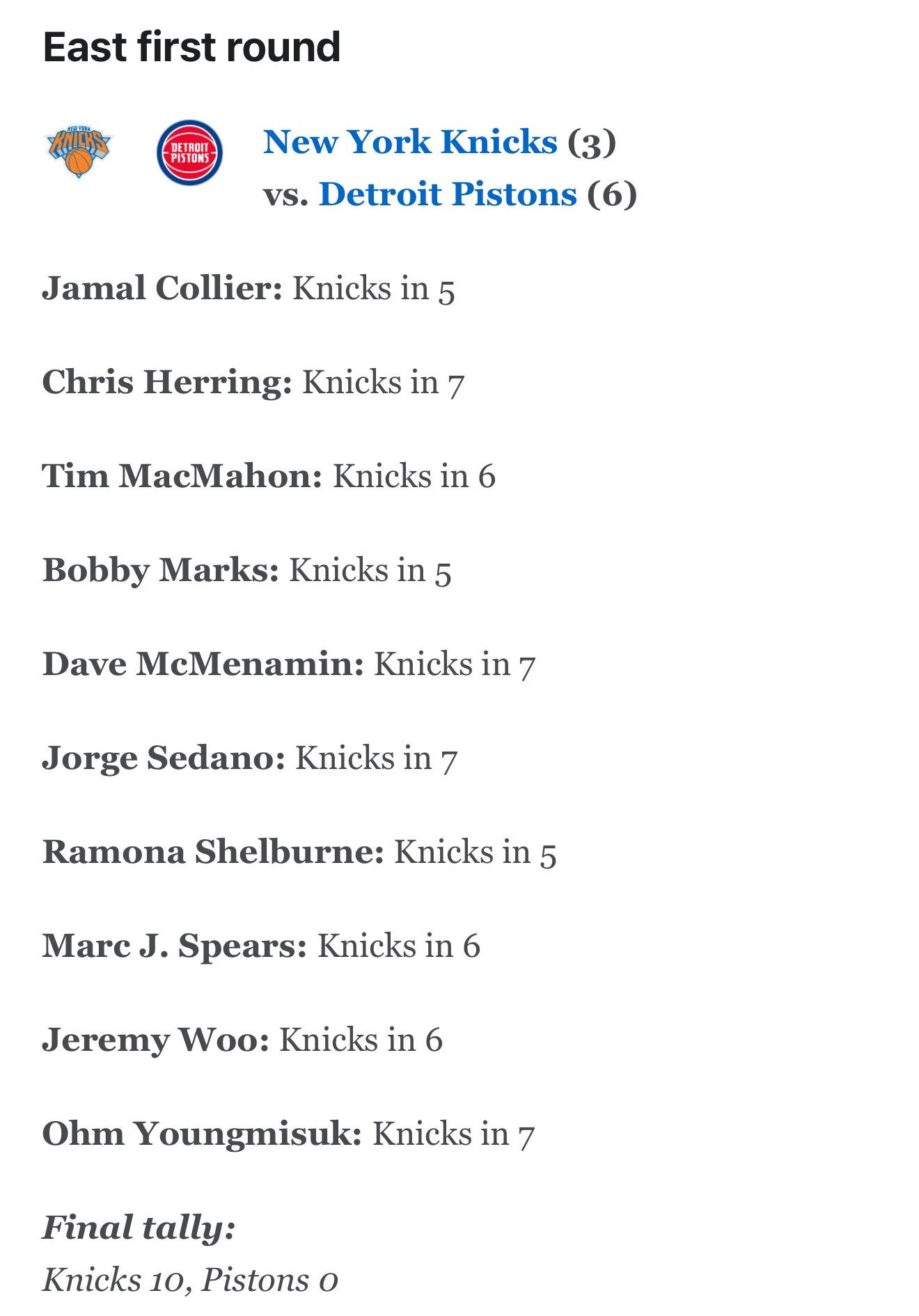 I think the Pistons can compete like hell in this matchup. I think they can test the Knicks. I certainly believe Detroit will win its first playoff game since 2008(!).