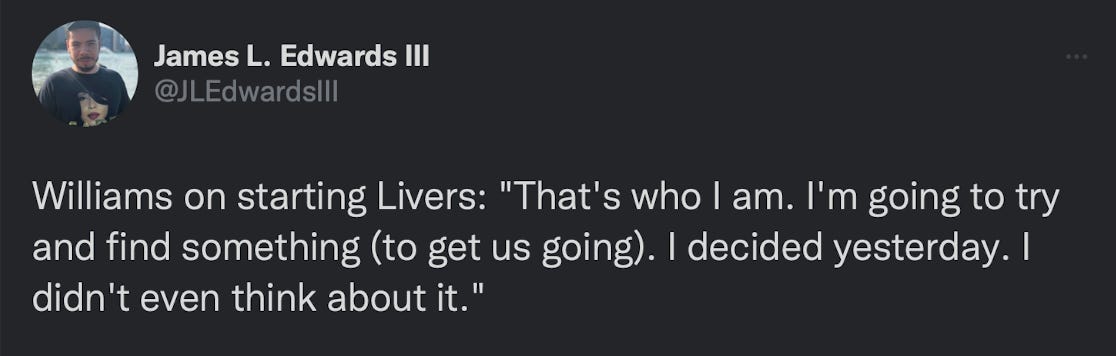 Starting a guy, and not thinking about it, seems like a bad strategy. Livers went on to score 10 of the Pistons’ 148 points that night. They gave up 154.